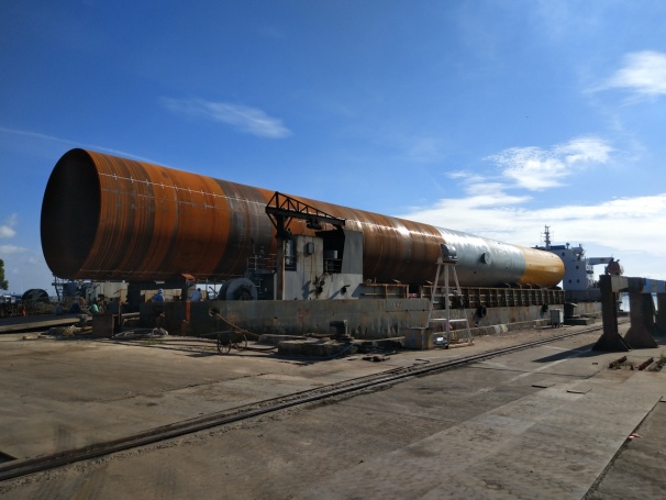 7月15日凌晨兩點多,歷經(jīng)1小時50分鐘的滾裝,中廣核后湖單樁項目首套單樁--77#樁的裝船作業(yè)于4點15分順利完成,完工在600T吊機底下靜候裝運20多天的第二套73#樁也于7月25日上午11點左右完成裝船交付,標志著中廣核后湖單樁項目首批單樁的生產交付任務全部完成!
