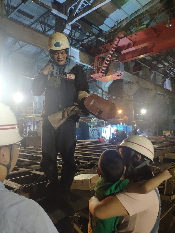 魯雄信是海洋工程部鉚焊工班的一名船舶電焊工,他的妻子每天既要工作,又要照顧年幼的孩子。在這次前往施工現(xiàn)場看望魯雄信之前,她對丈夫的工作不甚了解。路上,孩子時不時問媽媽:“爸爸在哪呀?”魯雄信的妻子一邊安撫孩子馬上就要見到爸爸了,一邊說,(項目緊張的時候)魯雄信時常加班,八九點才能到家,孩子很黏他爸爸。