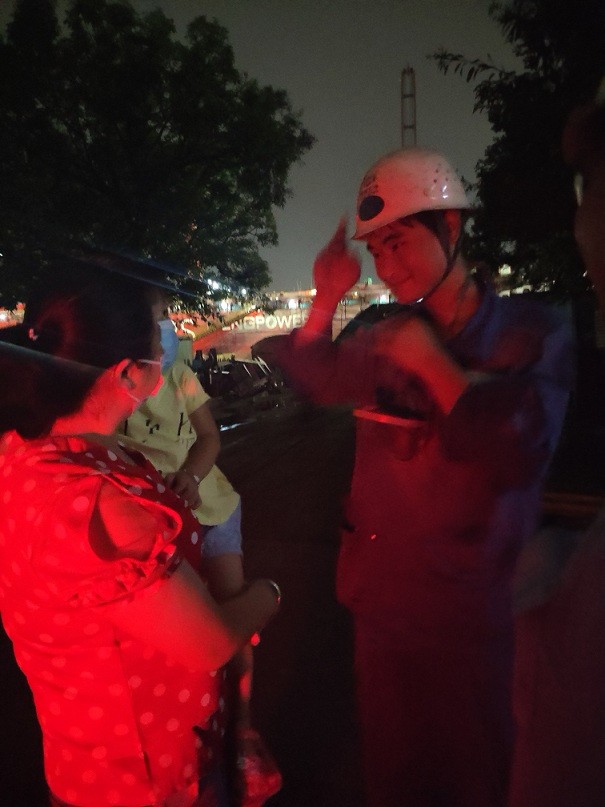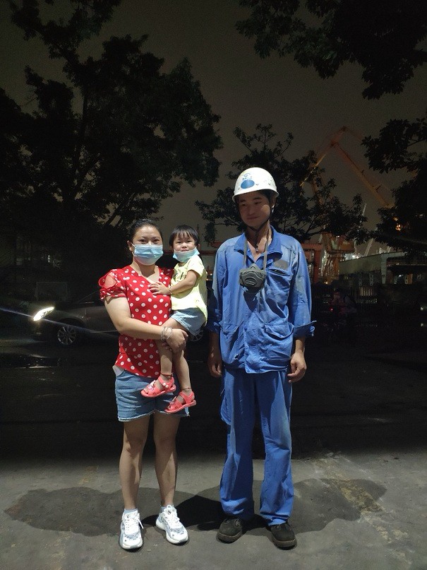 到了現(xiàn)場,面對妻兒的突然現(xiàn)身,帶著安全帽和防塵口罩的魯雄信眼中閃過驚喜。他正在加班趕項目,手上還拿著工具,一家三口湊在一起,小聲地說了幾句話。離開時,魯雄信沒有擁抱他們,只把手放在孩子身后,虛扶著他回到媽媽的懷里。走出了魯雄信的視線范圍,他的妻子一手拉著孩子,一手抹眼淚,“環(huán)境太艱苦了,他太辛苦了……”