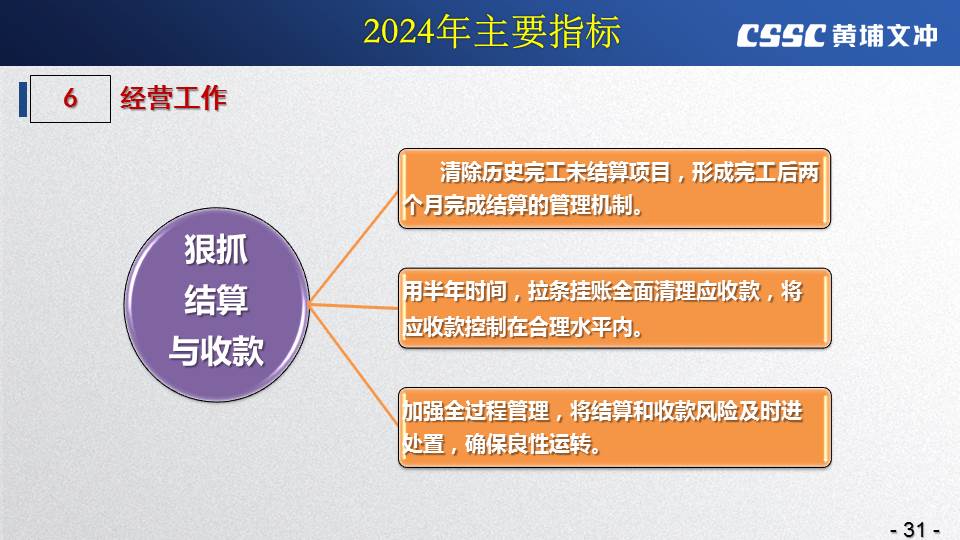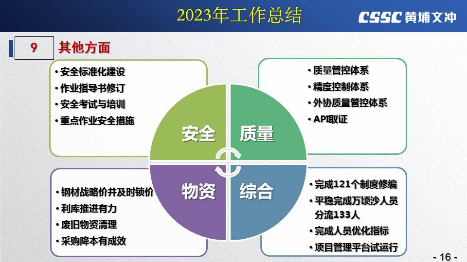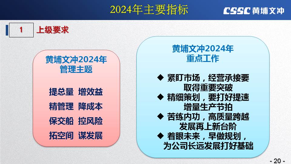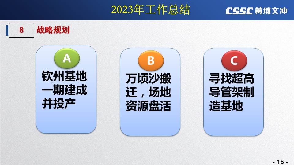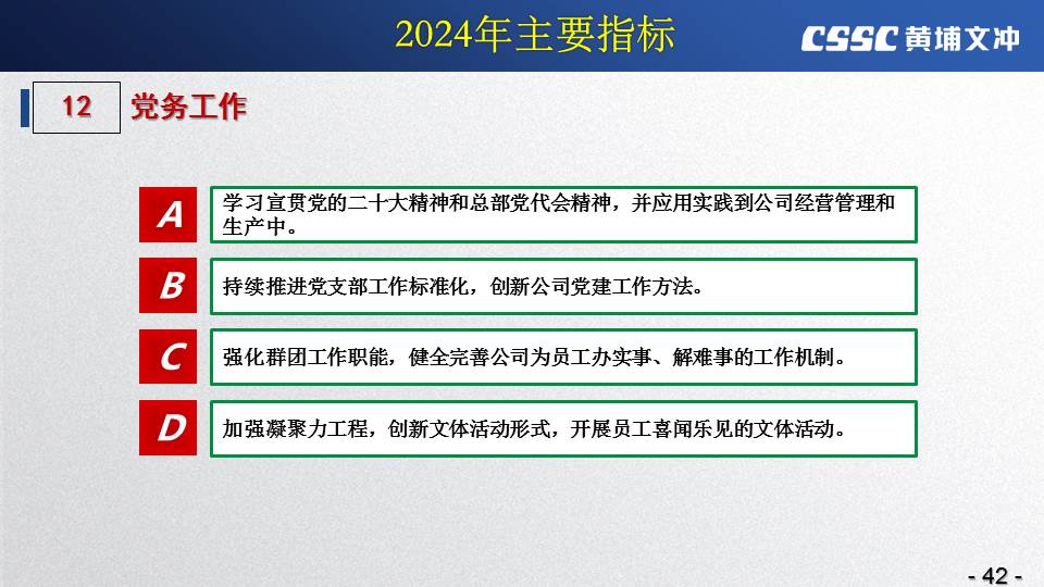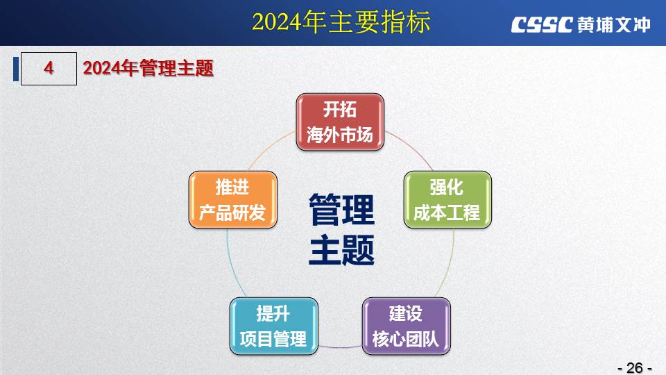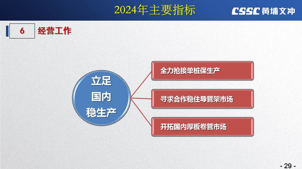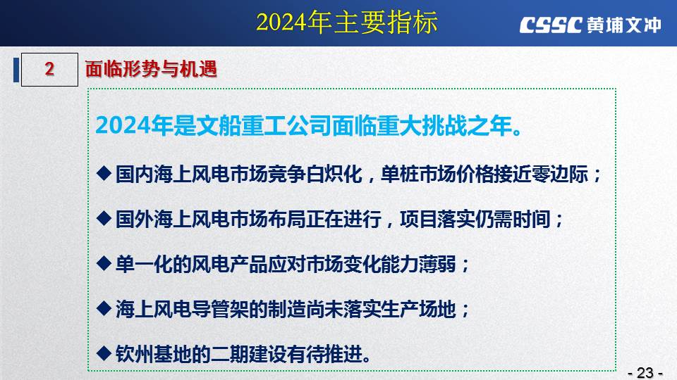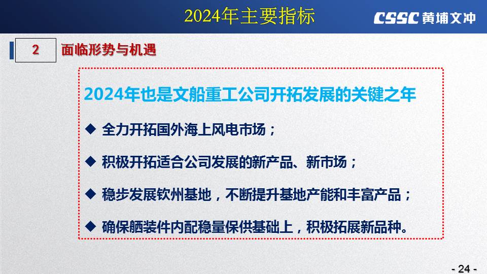 黃埔文沖公司羅兵總經(jīng)理指出,公司在過(guò)去的一年所取得的成績(jī)不容易,指標(biāo)基本完成,海外訂單有實(shí)質(zhì)性突破,國(guó)內(nèi)訂單承接情況不錯(cuò),管理團(tuán)隊(duì)精氣神不錯(cuò)。面對(duì)當(dāng)前的形勢(shì)機(jī)遇,羅總指出公司的未來(lái)發(fā)展大有希望!羅總要求全體干部員工要繼續(xù)保持高昂的斗志和滿滿的信心,繼續(xù)奮斗,并就公司2024年工作作了以下重要指示:
